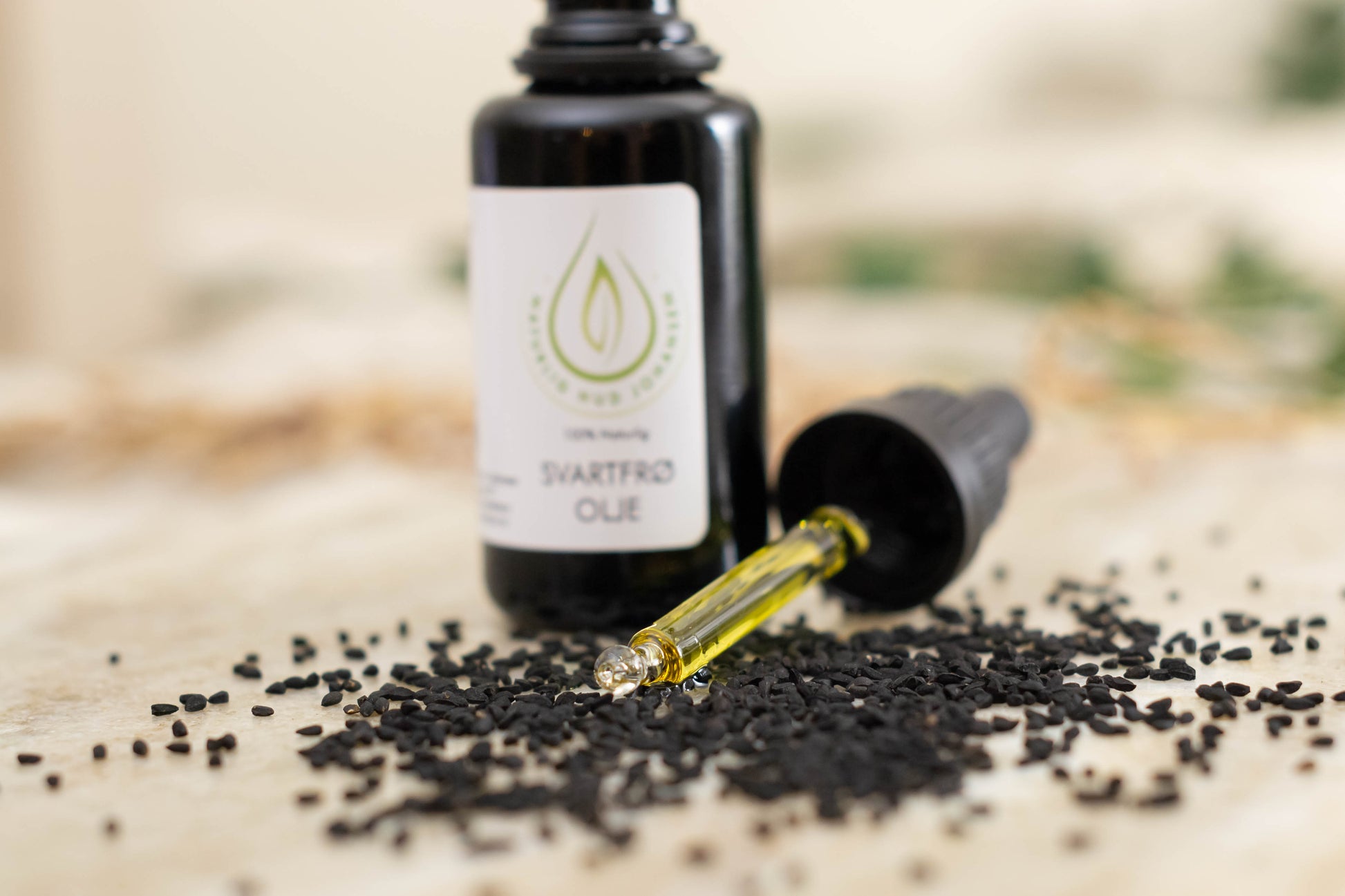 Økologisk og kaldpresset svartfrøolje med næringsmiddelkvalitet.
